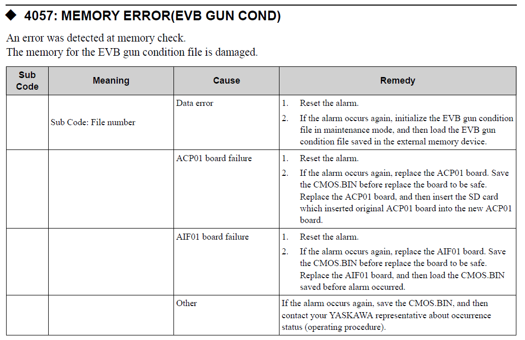 YRC1000 ALARM CODE 4057 MEMORY ERROR (EVB GUN COND) October 12, 2023 19:30 Updated Most Common Repair: Initialize EVB Gun Condition File and reload from backup. Comments 0 comments Please sign in to leave a comment.