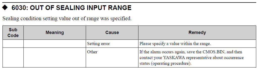 YRC1000 ALARM CODE 6030 OUT OF SEALING INPUT RANGE October 19, 2023 18:15 Updated Comments 0 comments Please sign in to leave a comment.