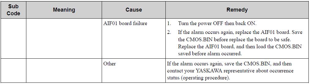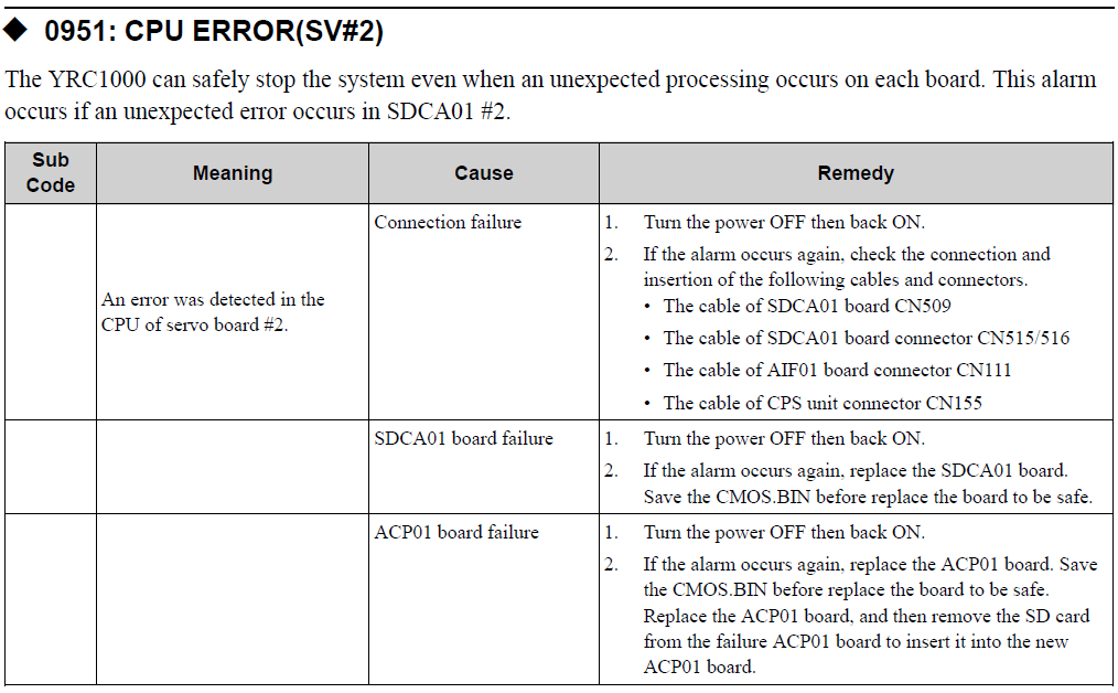 YRC1000 ALARM CODE 0951 CPU ERROR (SV#2) October 24, 2023 13:27 Updated Comments 0 comments Please sign in to leave a comment.