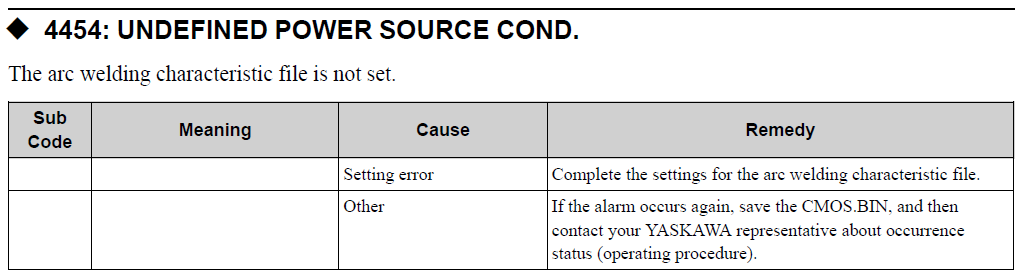 YRC1000 ALARM CODE 4454 UNDEFINED POWER SOURCE COND. October 30, 2023 17:35 Updated Related articles DX100 ALARM CODE 4454 UNDEFINED POWER SOURCE COND. Power Source Condition Files NX100 ALARM CODE 4454 UNDEFINED WELDER CONDITION FILE Macro Function YRC1000: Instructions Comments 0 comments Please sign in to leave a comment.