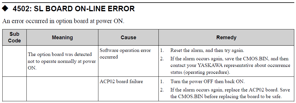 YRC1000 ALARM CODE 4502 SL BOARD ON-LINE ERROR October 30, 2023 20:29 Updated Related articles DX200 ALARM CODE 1051 SET-UP PROCESS ERROR (MOTION) Comments 0 comments Please sign in to leave a comment.
