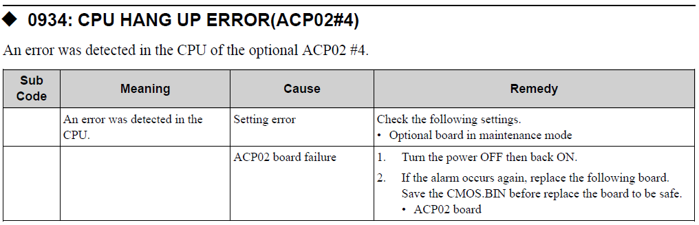 YRC1000 ALARM CODE 0934 CPU HANG UP ERROR (ACP02#4) October 31, 2023 13:33 Updated Comments 0 comments Please sign in to leave a comment.