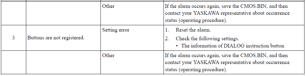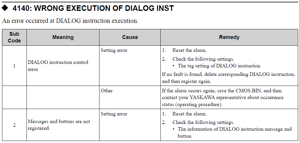 YRC1000 ALARM CODE 4140 WRONG EXECUTION OF DIALOG INST November 14, 2023 20:10 Updated Related articles YRC1000 ALARM CODE 4110 SHOCK SENSOR ACTION Comments 0 comments Please sign in to leave a comment.