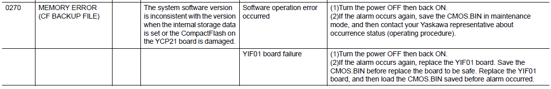 DX200 ALARM CODE 0270 MEMORY ERROR (CF BACKUP FILE) November 28, 2023 21:00 Updated Related articles DX200 ALARM CODE 0801 FILE LOAD ERROR (YCP21 CF) One Time Management Mode DX200: INFORM LANGUAGE DX200 CONTROLLER BATTERY REPLACEMENT DX200 ALARM CODE 0300 VERIFY ERROR (SYSTEM CONFIG-DATA) Comments 0 comments Please sign in to leave a comment.