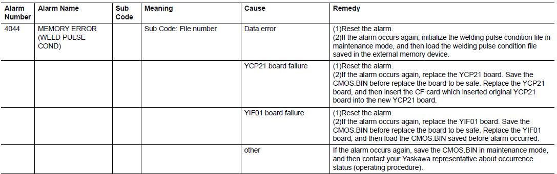 DX200 ALARM CODE 4044 MEMORY ERROR (WELD PULSE COND) December 11, 2023 14:12 Updated Comments 0 comments Please sign in to leave a comment.