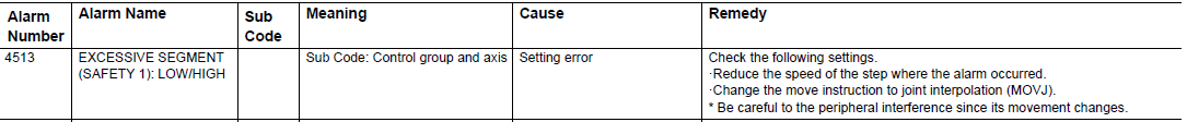DX100 ALARM CODE 4513 EXCESSIVE SEGMENT (SAFETY 1) LOW/HIGH March 19, 2024 17:17 Updated Related articles NX100 ALARM CODE 4513 EXCESSIVE SEGMENT (SAFETY: 1) :LOW DX100 ALARM CODE 4677 IMPOSSIBLE LINEAR MOTION FS100 ALARM CODE 4513 EXCESSIVE SEGMENT (SAFETY 1): Changing Speed Options for Editing the Concurrent I/O Ladder Comments 0 comments Please sign in to leave a comment.