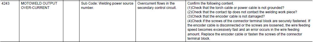 DX100 ALARM CODE 4243 MOTOWELD OUTPUT OVER-CURRENT March 27, 2024 20:23 Updated Related articles DX100 ALARM CODE 4244 MOTOWELD INPUT OVER-VOLTAGE DX100 ALARM CODE 4710 WELDER ERROR DX200 ALARM CODE 4109 DC 24V POWER SUPPLY FAILURE (I/O) Comments 0 comments Please sign in to leave a comment.
