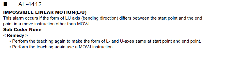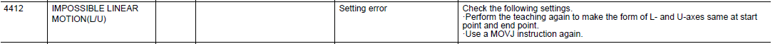 DX100 ALARM CODE 4412 IMPOSSIBLE LINEAR MOTION (L/U) March 28, 2024 12:47 Updated Related articles DX100 ALARM CODE 4413 IMPOSSIBLE LINEAR MOTION (S/L) Comments 0 comments Please sign in to leave a comment.