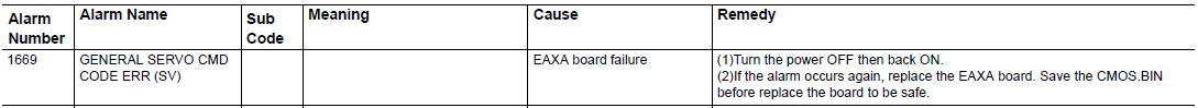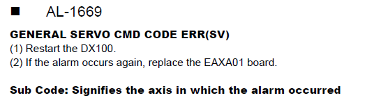 DX100 ALARM CODE 1669 GENERAL SERVO CMD CODE ERROR (SV) April 09, 2024 19:49 Updated Comments 0 comments Please sign in to leave a comment.