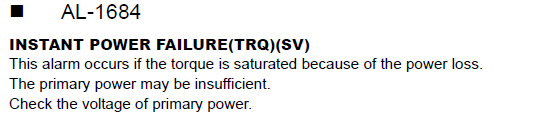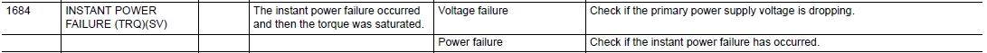 DX100 ALARM CODE 1684 INSTANT POWER FAILURE (TRQ)(SV) April 11, 2024 14:13 Updated Related articles DX100 ALARM CODE 4336 OPEN PHASE (CONVERTER) DX100 ALARM CODE 1685 INSTANT POWER FAILURE (TIME)(SV) DX100 ALARM CODE 0103 COMMUNICATION ERROR (EAXA#4) User Alarm and User Messages Explained YRC1000MICRO ALARM CODE 4611 OVER OPTON INST EXECUTION LIMIT Comments 0 comments Please sign in to leave a comment.