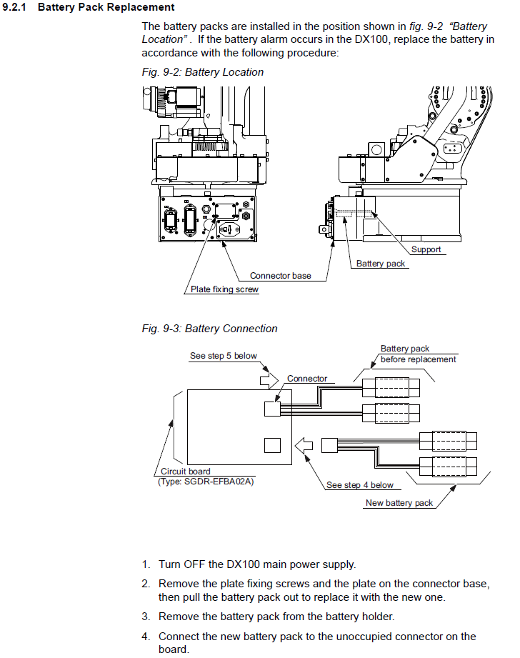 Battery Replacement MA1400/YR-MA01400-A10 Manipulator June 04, 2024 20:01 Updated Model Covered: YR-MA01400-A10 Battery Set: 149689-1 / HW0470360-A Related articles Battery Replacement MA1440/MH12 / YR-MA1440/MH12-A00 Manipulator Battery Replacement MA1440 / YR-MA1440/MH12-A10 Manipulator User Alarm and User Messages Explained How to Take a Backup on YRC1000 Controllers Battery Replacement HP20D / YR-HP0020D-A01 Manipulator Comments 0 comments Please sign in to leave a comment.