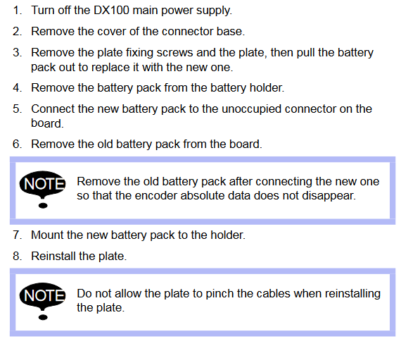 Battery Replacement UP350D-600 / YR-UP0350D-A30 Manipulator June 04, 2024 20:13 Updated Model Covered: YR-UP0350D-A30 Material Required: Battery Set 149689-1 / HW0470360-A. Related articles Battery Replacement EPH130RLD/YR-PH13RLD-A00 Manipulator DX200 CONTROLLER BATTERY REPLACEMENT Battery Replacement HP20RD / YR-HP020RD-A00 Manipulator Battery Replacement UP350D / YR-UP0350D-A00 Manipulator Comments 0 comments Please sign in to leave a comment.