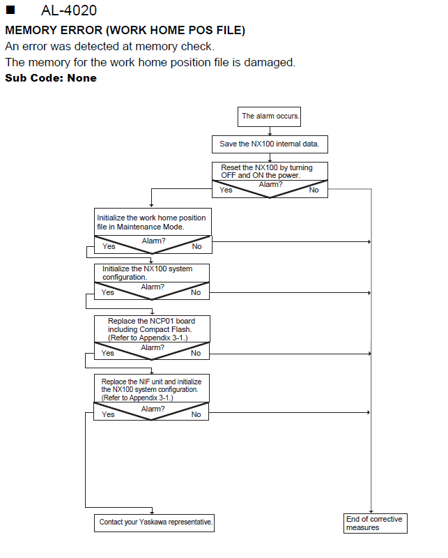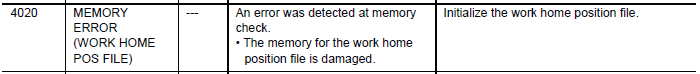 NX100 ALARM CODE 4020 MEMORY ERROR (WORK HOME POS FILE) June 13, 2024 18:10 Updated Related articles NX100 ALARM CODE 4021 MEMORY ERROR (CONVEYOR COND FILE) NX100 ALARM CODE 4019 MEMORY ERROR (CUTTING COND FILE) Comments 0 comments Please sign in to leave a comment.
