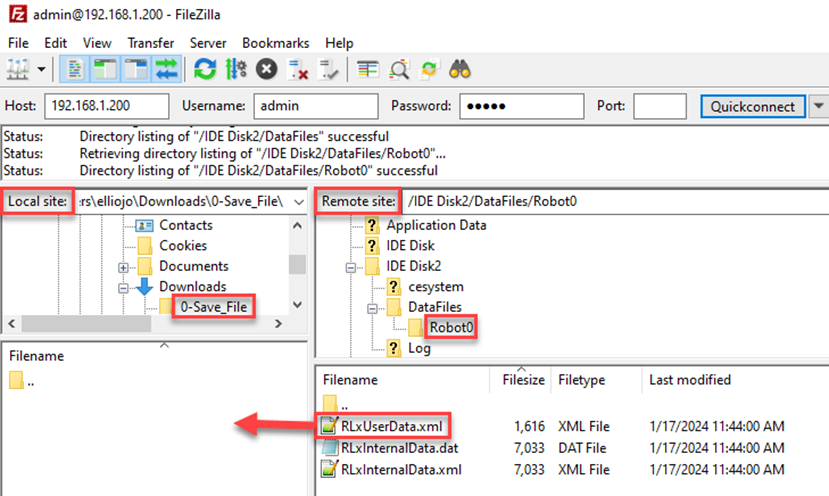 /IDE Disk2/DataFiles/Robot0 - Under the Filename column, select and drag the RLxUserData.xml file to the computer (Local site) side of the screen.