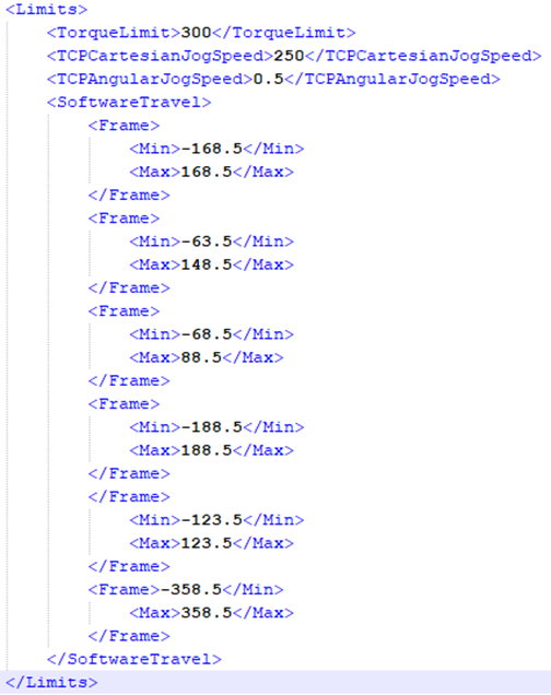 The MLX100 pendant and HMI have a Robot Configuration screen. The Minimum and Maximum Soft Travel Limits of each axis can modified on this screen. However, if you cycle power to the MLX100, the Soft Limits will be set back to the default values.