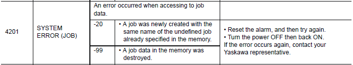 NX100 ALARM CODE 4201 SYSTEM ERROR (JOB) June 19, 2024 13:04 Updated Related articles YRC1000MICRO ALARM CODE 4201 SYSTEM ERROR (JOB) NX100 ALARM CODE 4200 SYSTEM ERROR (FILE DATA) DX100 ALARM CODE 4338 REGENERATIVE TROUBLE (CONVERTER) Concurrent I/O Overview Using File Transfer Protocol (FTP) with Yaskawa Controllers Comments 0 comments Please sign in to leave a comment.