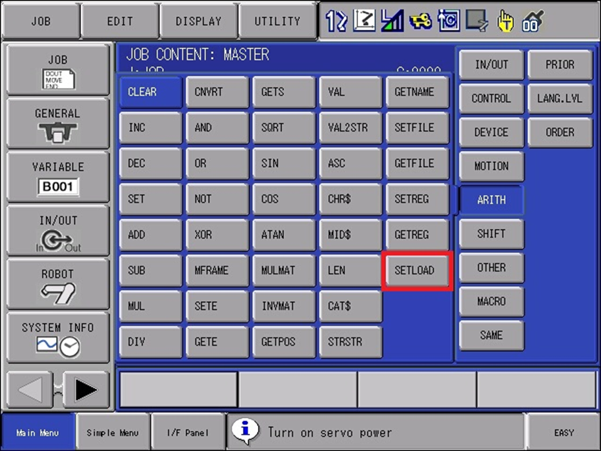 New INFORM commands may become available only when a newer version of controller software is loaded. For Example, the SETLOAD command did not become available and will not appear unless software version YAS 5.26 (YBS 4.13 for YRC1000micro) or newer is loaded.