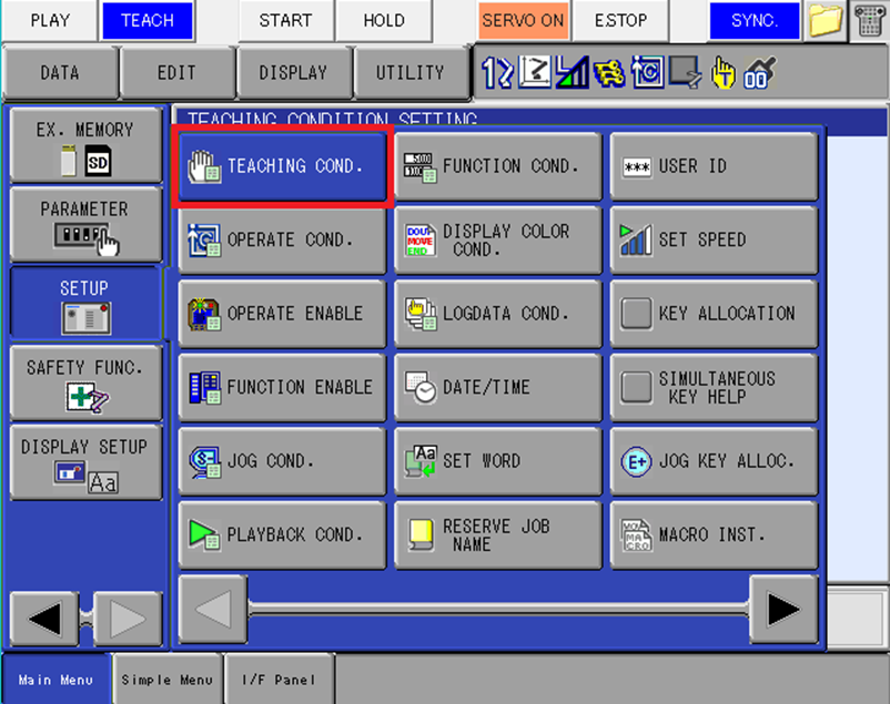 It is first necessary to confirm that the LANGUAGE LEVEL is set to EXPANDED. If the setting is STANDARD some higher-level commands will not be available. Navigate to the MAIN MENU -> SETUP -> TEACHING COND.