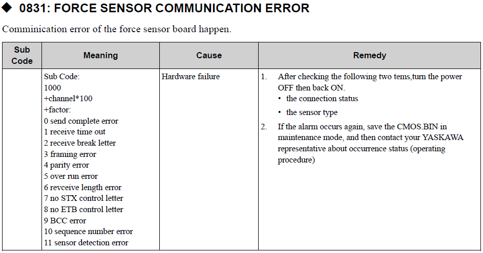 YRC1000MICRO ALARM CODE 0831 FORCE SENSOR COMMUNICATION ERROR August 14, 2024 13:35 Updated Related articles YRC1000: General Operators Comments 0 comments Please sign in to leave a comment.