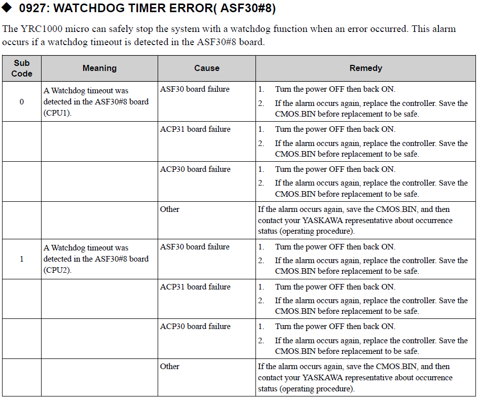 YRC1000MICRO ALARM CODE 0927 WATCHDOG TIMER ERROR (ASF30#8) August 14, 2024 14:07 Updated Comments 0 comments Please sign in to leave a comment.