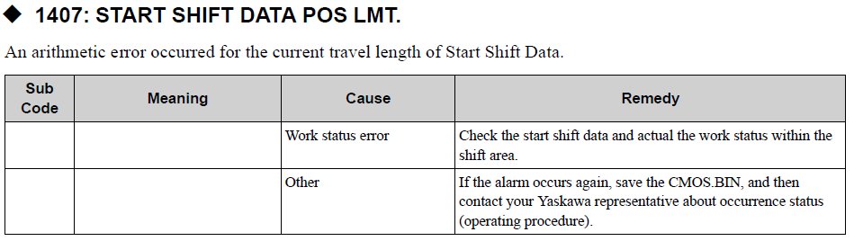 YRC1000MICRO ALARM CODE 1407 START SHIFT DATA POS LMT. August 16, 2024 14:00 Updated Comments 0 comments Please sign in to leave a comment.