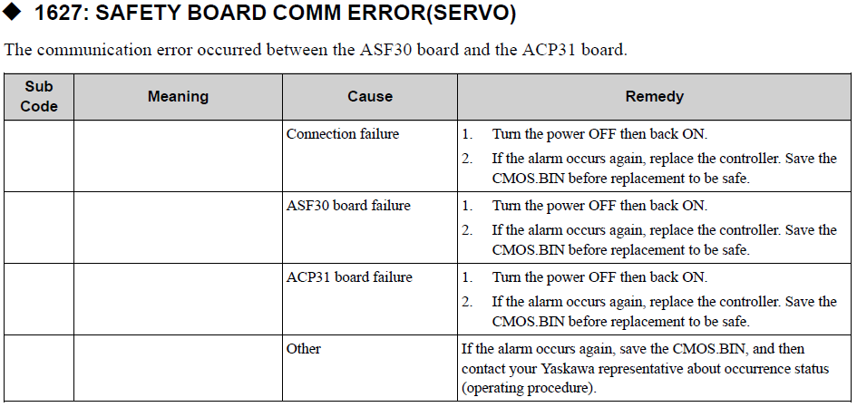 YRC1000MICRO ALARM CODE 1627 SAFETY BOARD COMM ERROR (SERVO) August 16, 2024 15:46 Updated Related articles YRC1000MICRO ALARM CODE 1860 M-SAFETY COMMUNICATE ERROR DX200 ALARM CODE 1627 F-SAFE BOARD COMMUNICATION ERROR (SERVO) YRC1000 ALARM CODE 1627 SAFETY BOARD COMM ERROR (SERVO) YRC1000 ALARM CODE 1866 M-SAF F-SAFETY COMM ERROR DX200 Comment Out Function Comments 0 comments Please sign in to leave a comment.