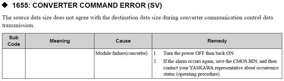 YRC1000MICRO 1655 CONVERTER COMMAND ERROR (SV) August 16, 2024 20:12 Updated Related articles YRC1000MICRO ALARM CODE 0010 CPU BOARD INSERTION ERROR (SV) YRC1000 ERROR MESSAGE LIST YRC1000 ALARM CODE 0320 VERIFY ERROR (I/O MODULE) General Information Regarding Reaction Forces and Moments for a Robot YRC1000MICRO ERROR LIST Comments 0 comments Please sign in to leave a comment.