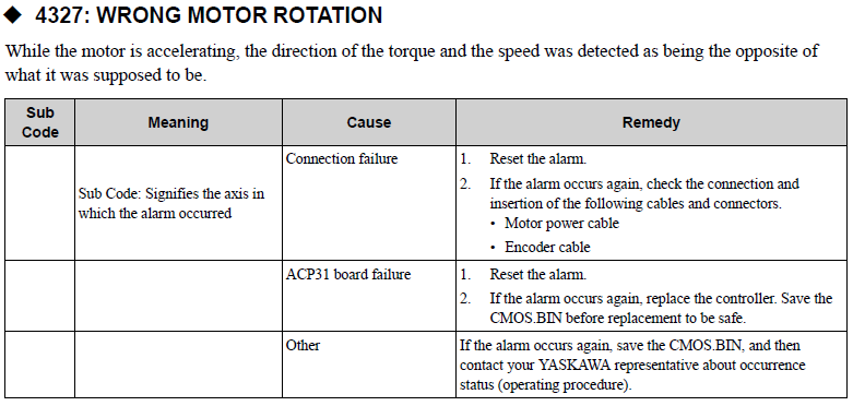 YRC1000MICRO ALARM CODE 4327 WRONG MOTOR ROTATION August 19, 2024 13:38 Updated Related articles NX100 ALARM CODE 4327 MOTOR ROTATION ERROR DX100 ALARM CODE 4327 WRONG MOTOR ROTATION YRC1000: Instructions Alarm 4768 [32] M_SAF GENERAL OUT FB DIAG ERROR2 Home Position, Second Home Position, and Work Home Position Comments 0 comments Please sign in to leave a comment.