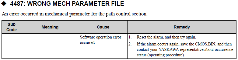 YRC1000MICRO ALARM CODE 4487 WRONG MECH PARAMETER FILE October 02, 2025 20:21 Updated Comments 0 comments Please sign in to leave a comment.