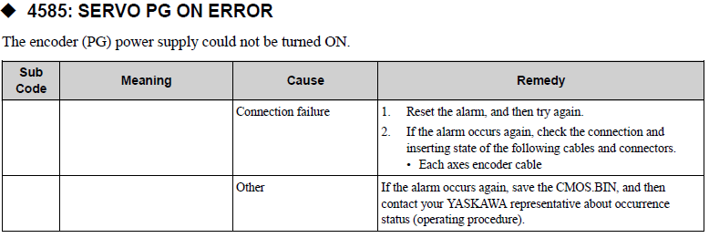YRC1000MICRO ALARM CODE 4585 SERVO PG ON ERROR August 19, 2024 19:30 Updated Related articles NX100 ALARM CODE 4311 ENCODER BACK-UP ERROR YRC1000 ALARM CODE 1325 COMMUNICATION ERROR(ENCODER) Comments 0 comments Please sign in to leave a comment.
