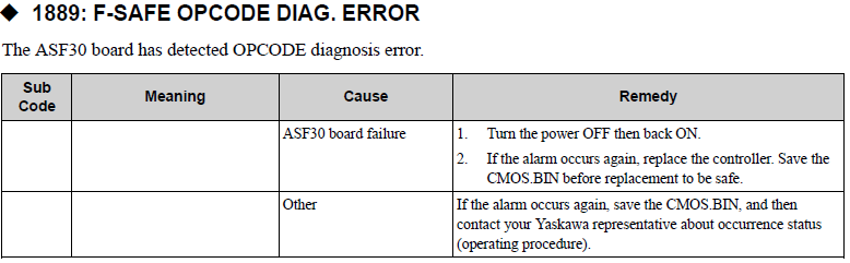 YRC1000MICRO ALARM CODE 1889 F-SAFE OPCODE DIAG. ERROR August 20, 2024 13:38 Updated Comments 0 comments Please sign in to leave a comment.