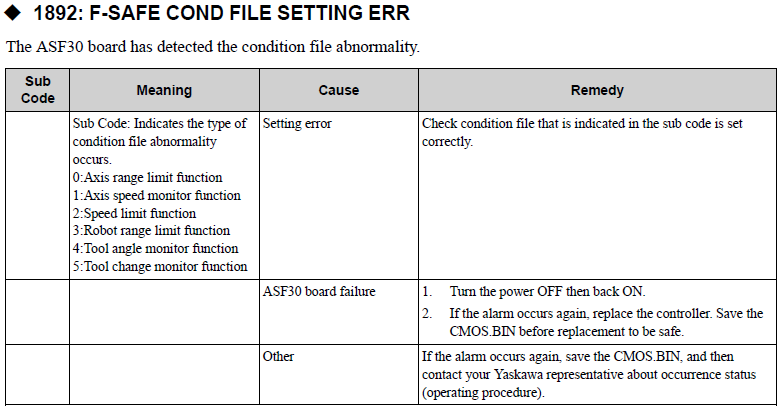 YRC1000MICRO ALARM CODE 1892 F-SAFE COND FILE SETTING ERROR August 20, 2024 13:42 Updated Related articles Functional Safety Unit Series: Axis Range Limit Comments 0 comments Please sign in to leave a comment.