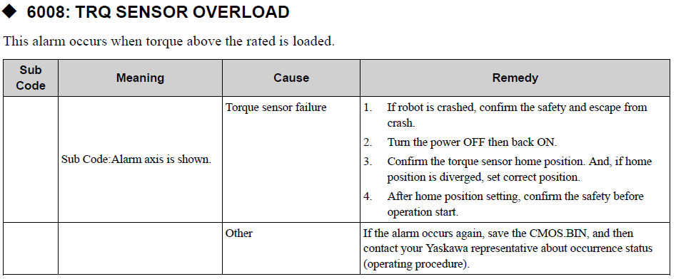 YRC1000MICRO ALARM CODE 6008 TRQ SENSOR OVERLOAD August 23, 2024 12:49 Updated Related articles YRC1000 ALARM CODE 6008 TRQ SENSOR OVERLOAD YRC1000 ERROR MESSAGE LIST HC Robot Series Torque Sensor Origin Position Calibration Macro Function Alarm 1926 TRQ SENSOR RECEIVING ERROR Comments 0 comments Please sign in to leave a comment.