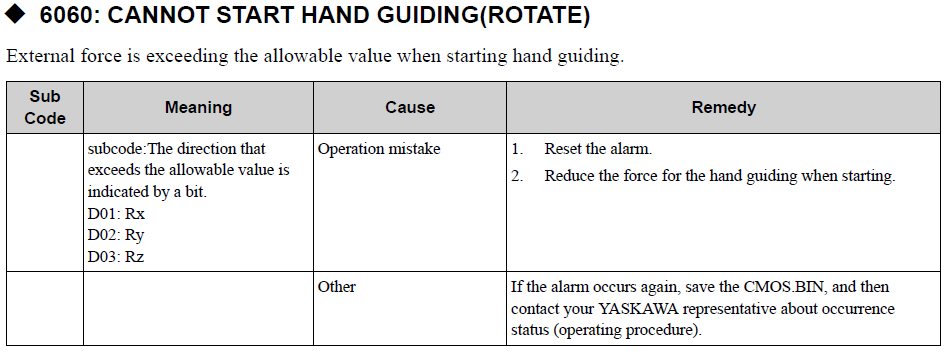 YRC1000MICRO ALARM CODE 6060 CANNOT START HAND GUIDING (ROTATE) August 23, 2024 15:38 Updated Comments 0 comments Please sign in to leave a comment.