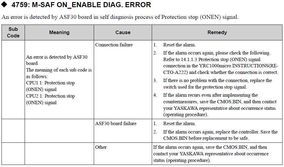 YRC1000MICRO ALARM CODE 4759 M-SAFE ON_ENABLE DIAG. ERROR August 26, 2024 13:36 Updated Related articles Grease Procedure (PM) GP180-120 / YR-1-06VX180-120-A00 Manipulator Comments 0 comments Please sign in to leave a comment.