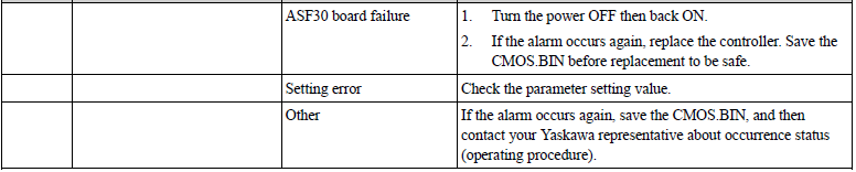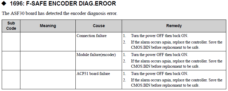 YRC1000MICRO ALARM CODE 1696 F-SAFE ENCODER DIAG. ERROR August 27, 2024 20:19 Updated Related articles YRC1000 ALARM CODE 1696 F-SAFE ENCODER DIAG.ERROR YRC1000 ALARM CODE 1623 F-SAFE ENCODER CORR. NUMBER OVER YRC1000 ALARM CODE 1613 F-SAFE ENCODER COMM. ERR 1 Home Position, Second Home Position, and Work Home Position YRC1000MICRO ALARM CODE 0400 PARAMETER TRANSMISSION ERROR Comments 0 comments Please sign in to leave a comment.