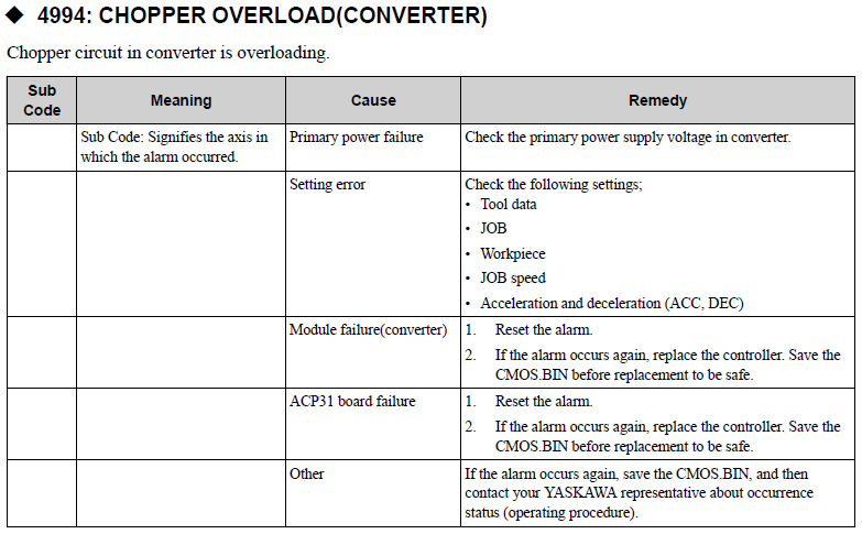 YRC1000MICRO ALARM CODE 4994 CHOPPER OVERLOAD (CONVERTER) September 03, 2024 20:35 Updated Comments 0 comments Please sign in to leave a comment.