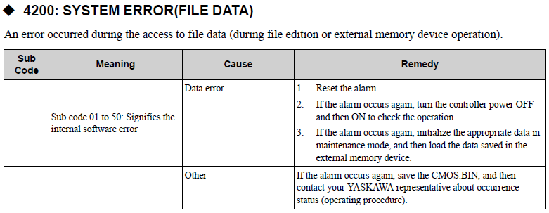 YRC1000MICRO ALARM CODE 4200 SYSTEM ERROR (FILE DATA) September 04, 2024 15:23 Updated Related articles YRC1000: Instructions Comments 0 comments Please sign in to leave a comment.