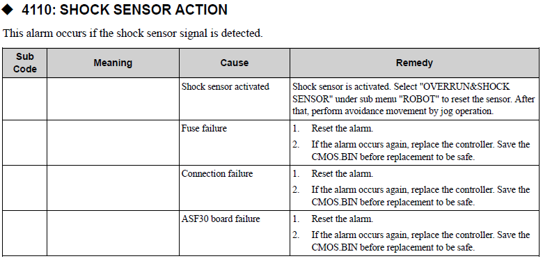 YRC1000MICRO ALARM CODE 4110 SHOCK SENSOR ACTION September 06, 2024 20:34 Updated Related articles Overrun / Shock Sensor Alarm Recovery YRC1000 ALARM CODE 4110 SHOCK SENSOR ACTION YRC1000: Instructions NX100 ALARM CODE 4110 SHOCK SENSOR ACTIVATION NX100 ALARM CODE 4109 DC24V POWER SUPPLY FAILURE (I/O) Comments 0 comments Please sign in to leave a comment.