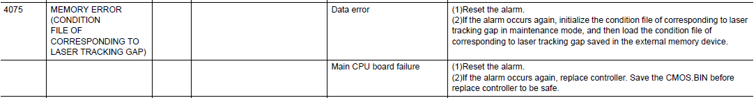 FS100 ALARM CODE 4075 MEMORY ERROR (CONDITION FILE OF CORRESPONDING TO LASER TRACKING GAP) October 01, 2024 14:44 Updated Comments 0 comments Please sign in to leave a comment.