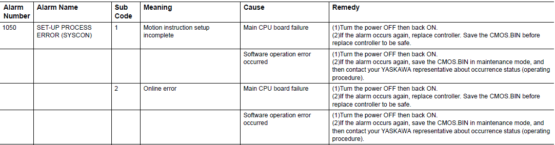 FS100 ALARM CODE 1050 SET-UP PROCESS ERROR (SYSCON) October 04, 2024 14:36 Updated Related articles Overrun / Shock Sensor Alarm Recovery YRC1000 ALARM CODE 1051 SETUP PROCESS ERROR (MOTION) Comments 0 comments Please sign in to leave a comment.