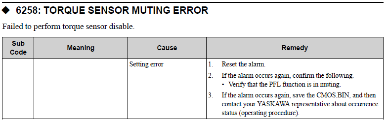 YRC1000 ALARM CODE 6258 TORQUE SENSOR MUTING ERROR July 24, 2025 17:42 Updated Comments 0 comments Please sign in to leave a comment.