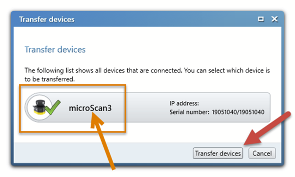 This pop-up window appears. Confirm that the device type is “microScan3”, then press the [Transfer devices] button