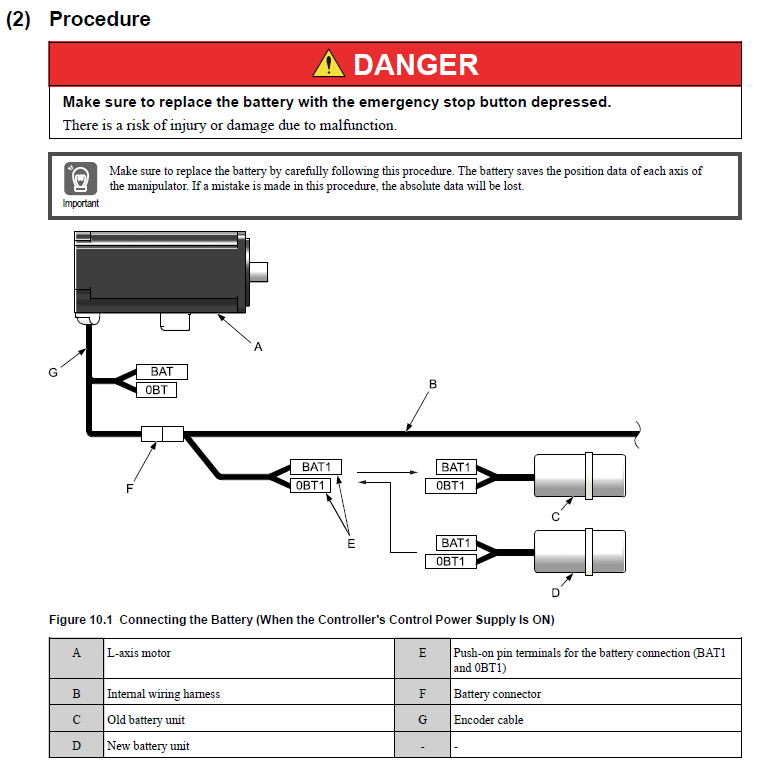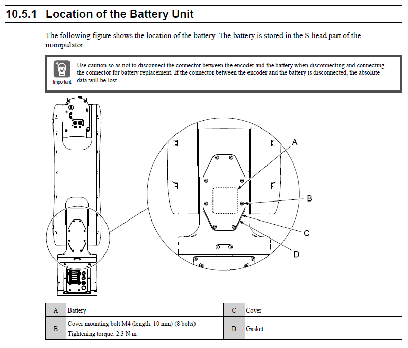 Battery Replacement GP10 / YR-1-06VX10-A00 Manipulator August 25, 2025 17:51 Updated Model Covered: YR-1-06VX10-A00 Related articles Parts YRC1000 GP10 / YR-1-06VX10-A00 Manipulator And Controller Maintenance Inspection Schedule YRC1000 AR900 / YR-1-06VX7-A00 Manipulator Battery Replacement AR900 / YR-1-06VX7-A00 Manipulator Grease Procedure (PM) GP10 / YR-1-06VX10-A00 Manipulator Battery Replacement GP10 / YR-1-06VX10-A01 Manipulator Comments 0 comments Please sign in to leave a comment.
