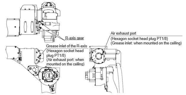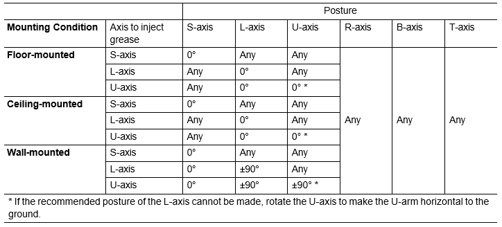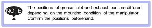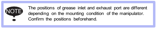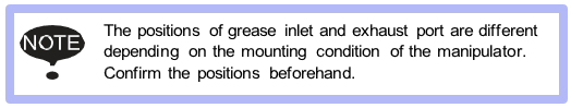 1. Before injecting grease, the posture of the manipulator must be set as indicated in table 4-1 “Recommended Posture for Grease Injection” . If it is difficult to make the recommended posture because of external cabling or etc., adjust the posture as much as possible to make the position of grease inlet located in the lower part and the position of exhaust port located in the upper part. If the exhaust port is located in the lower part, grease may not be exchanged properly.