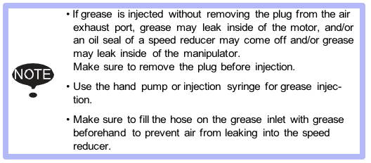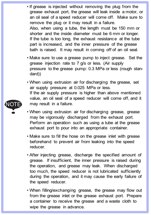 Make sure to follow the instructions listed below at grease replenishment/ exchange. Failure to observe the following notes may result in damage to motor and speed reducer.