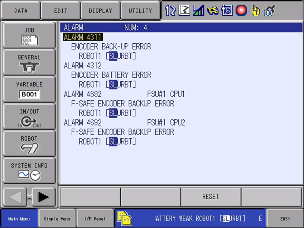 When an Encoder Backup Battery fails on an HC robot the controller will display a variety of Alarms: