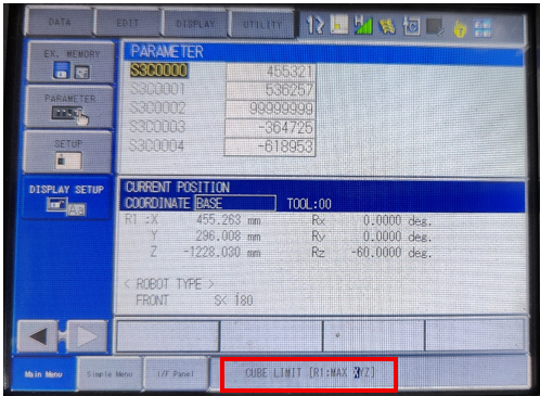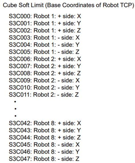 After cube soft limit check has been enabled, navigate to the S3C parameters and start with S3C0000. Each of these cube limits correspond to the base coordinates of the active robot TCP and must be formatted in micrometers (µm). For example, if the robot needs to stop moving at X=455.5mm in the positive X-direction and X= -375mm in the negative X-direction, then the value 455500 would be entered into S3C0000 and the value 375000 would be entered into S3C0003. If a cube limit is not needed or is irrelevant to the application, then simply type all +/- 9’s into that parameter.