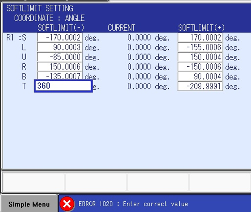 It is possible to further reduce the Soft Limits by editing them on the SOFTLIMIT SETTING screens either by entering new degree or pulse values. If a larger value is entered in an attempt to increase the Soft Limits beyond the values set at Initialization an "ERROR 1020 : Enter correct value" will occur (See Figure 3).