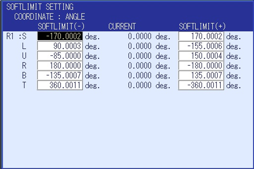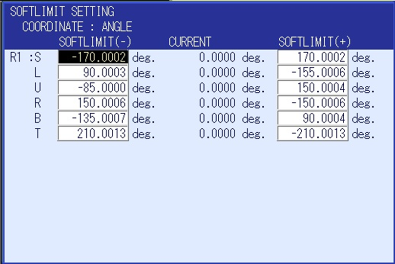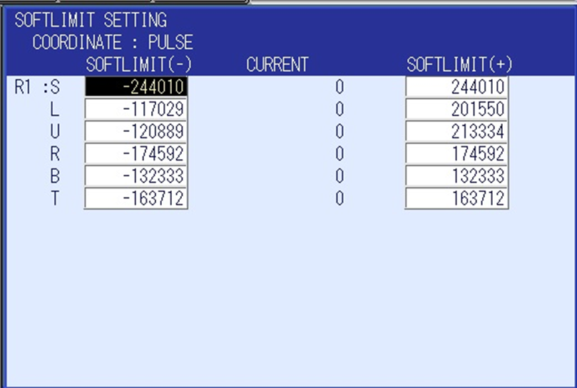 The Axis Soft Limits of DX200 robots are set in the controller when it is first Initialized. It is possible to further restrict the Limits by editing them on the ROBOT -> SOFTLIMIT SETTING screens. In order to increase the Limits beyond the values established at Initialization parameters must be adjusted.